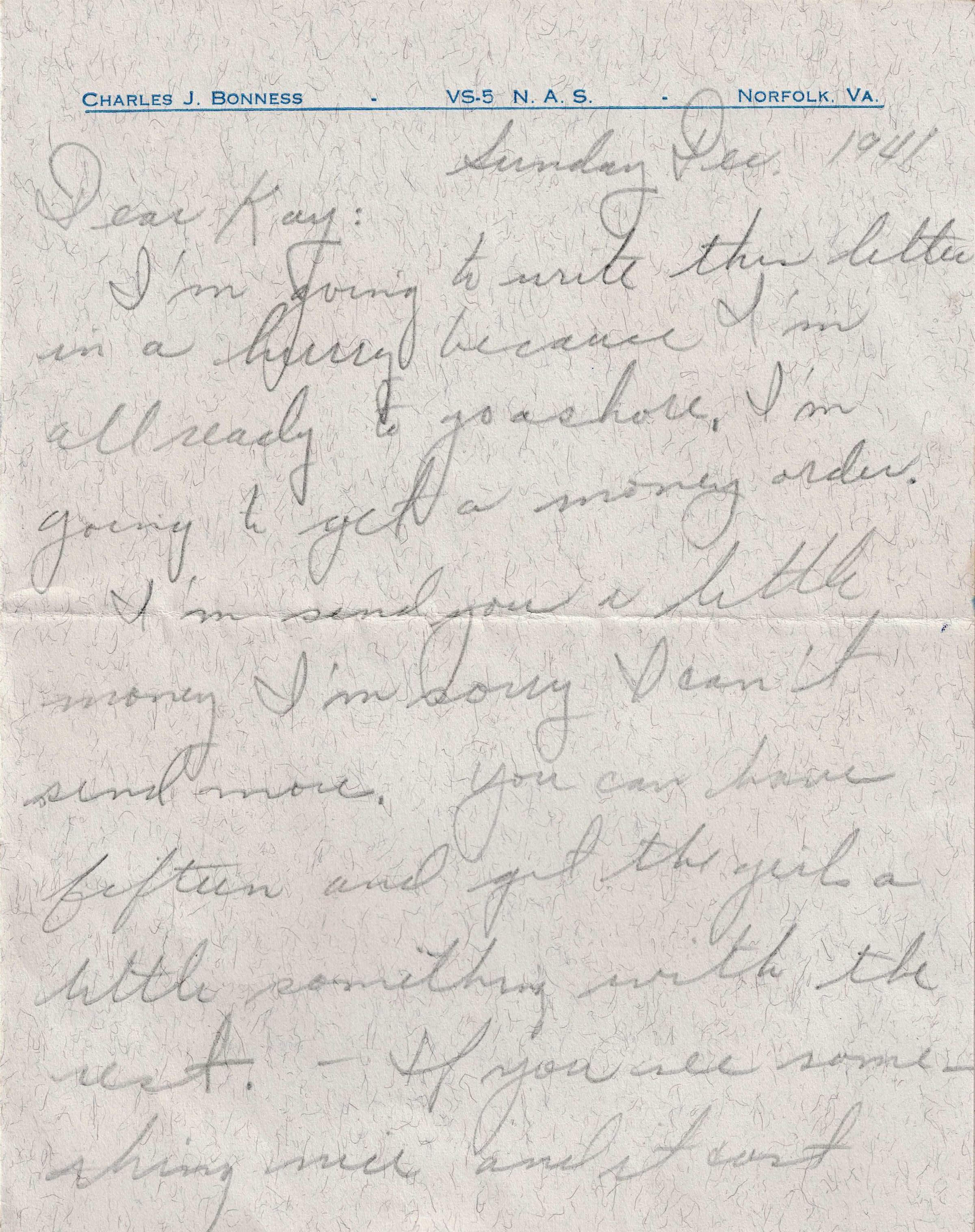 A letter from Charles "Chuck" Bonness to his sister, Catherine Bonness, December 7, 1941.